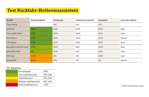 Assistenzsysteme zum Parkieren und Rückwärtsfahren können schwere Unfälle und Sachschäden vermeiden, indem sie Fahrerinnen und Fahrer warnen oder eine Vollbremsung einleiten. Der TCS hat Rückfahr-Notbremsassistenten von acht Fahrzeugmodellen getestet und festgestellt, der Fahrzeugpreis spielt bei der Qualität keine Rolle und alle getesteten Systeme gehen über die gesetzlichen Mindestanforderungen hinaus.
