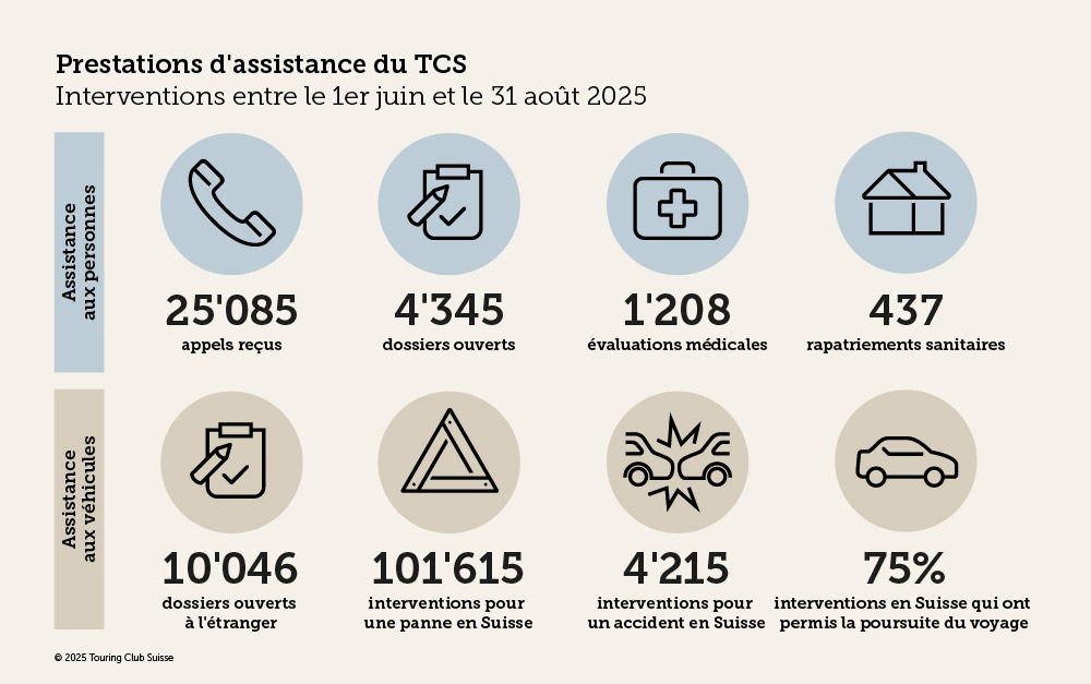 Les Suissesses et Suisses se sont beaucoup déplacés cet été, que ce soit dans le pays ou à l'étranger. Cette forte mobilité a entraîné une demande soutenue d'assistance pour les membres du TCS. Comparée à 2024, la saison estivale a présenté des chiffres similaires, confirmant que le niveau de voyages est resté élevé cet été.
