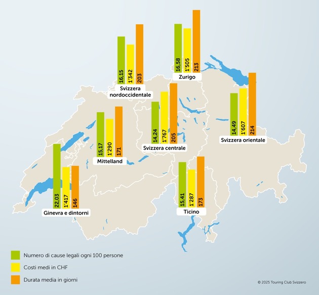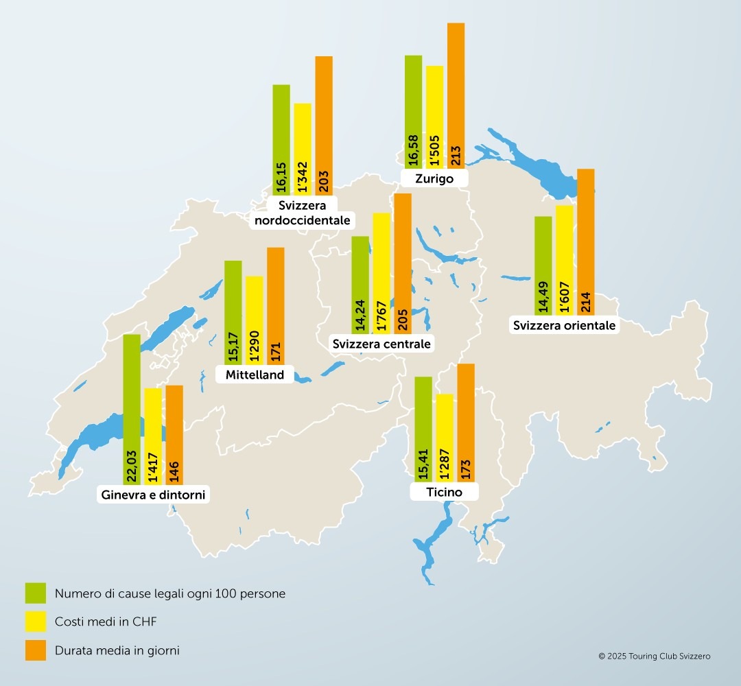 Le valutazioni si basano sul portafoglio della clientela dell'assicurazione protezione giuridica TCS nei settori Protezione giuridica circolazione, Protezione giuridica privata, Protezione giuridica immobili, Libretto Protezione Internet e Libretto ETI, con un totale di circa 1,1 milioni di polizze. I dati si riferiscono a casi giuridici aperti (per quanto riguarda la frequenza) e chiusi (per quanto riguarda i costi e la durata) nel 2024.