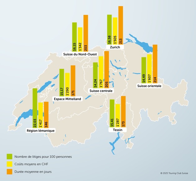 Les évaluations se basent sur le portefeuille de clients et clientes de l'assurance TCS Protection juridique dans les domaines de la protection juridique circulation, de la protection juridique privée, de la protection juridique immeuble, du Livret Protection Internet et du Livret ETI, avec un total d'environ 1,1 million de polices. Elles se rapportent à des litiges ouverts (en ce qui concerne la fréquence) ou clôturés (en ce qui concerne les coûts et la durée) en 2024.