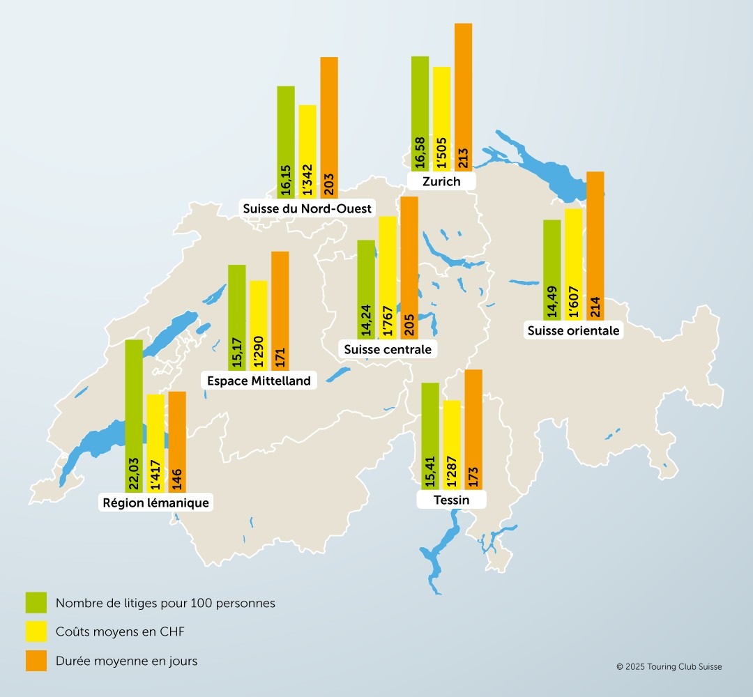 Le dernier baromètre TCS des litiges montre que le nombre de litiges a diminué en 2024 par rapport à 2019. Toutefois, dans le domaine de la location ou de la propriété immobilière, les litiges juridiques impliquant l'assurance protection juridique du TCS restent fréquents. Parmi les régions étudiées, la plupart des cas proviennent de la région lémanique.