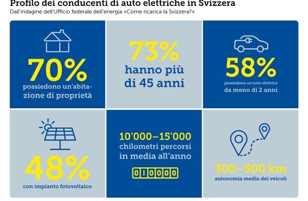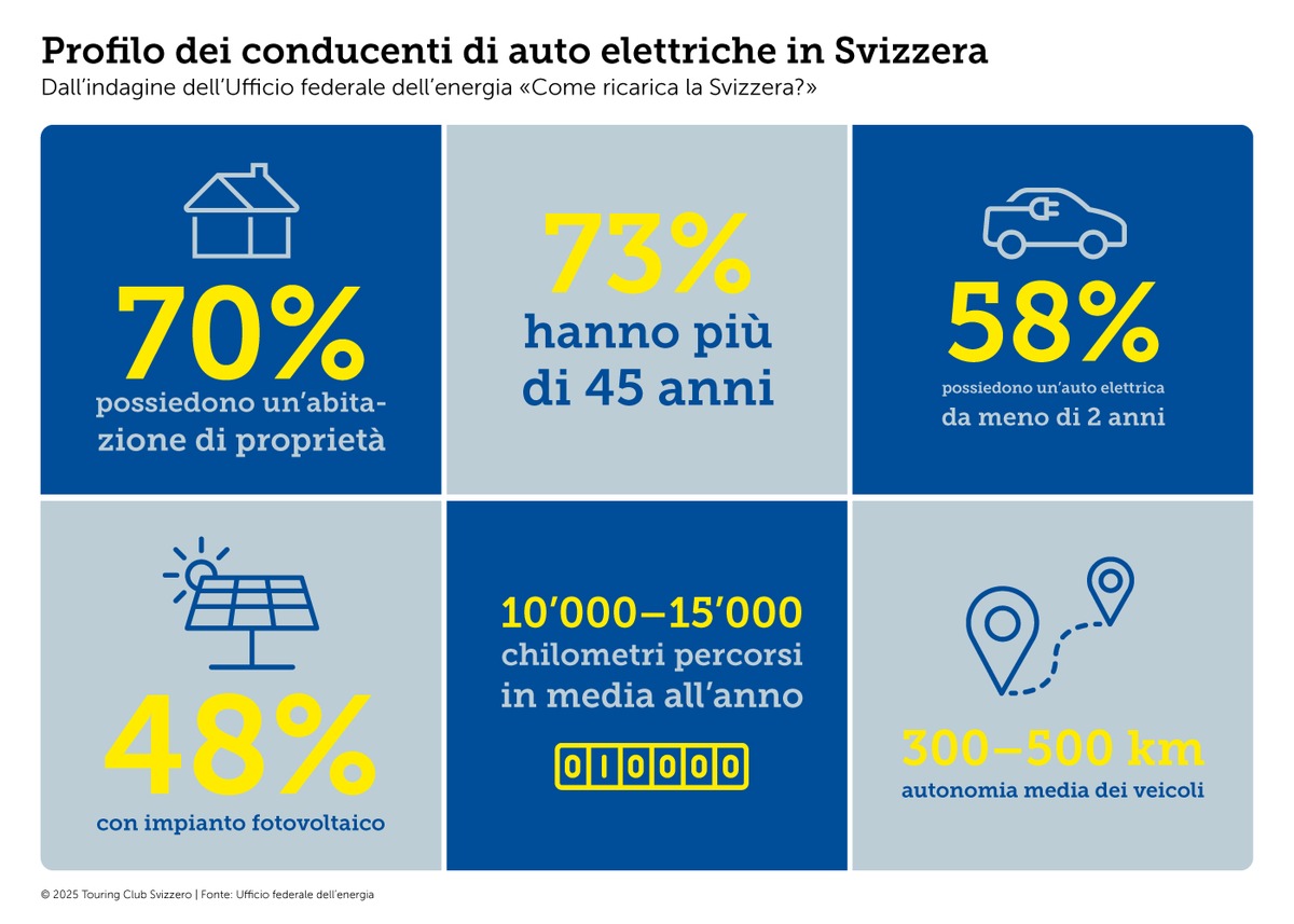 " Come ricarica la Svizzera? " è il sondaggio rappresentativo condotto per la prima volta, su incarico dell'Ufficio federale dell'energia e con il sostegno di vari partner, tra cui il Touring Club Svizzero, tra i conducenti di auto elettriche di tutte le regioni linguistiche della Svizzera. L'indagine offre uno sguardo sulle abitudini di ricarica di chi guida veicoli elettrici a batteria (BEV) e ibridi plug-in (PHEV). La maggioranza percorre tra 10'000 e 15'000 chilometri all'anno, con un'autonomia di 300-500 chilometri. Il 73 % degli intervistati ha più di 45 anni e la maggior parte dispone di un garage o di un parcheggio fisso coperto o esterno.