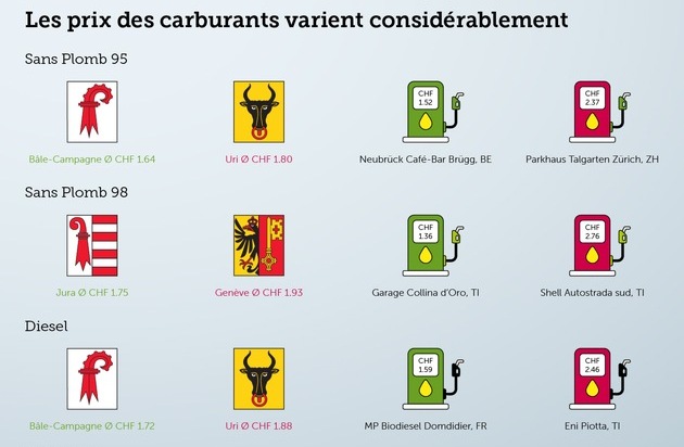 En analysant les moyennes par canton, il apparaît que le diesel et le sans-plomb 95 sont les moins chers dans le canton de Bâle-Campagne, tandis que le sans-plomb 98 est le plus avantageux dans le canton du Jura. À l'inverse, les prix les plus élevés ont été relevés dans les cantons d'Uri (sans-plomb 95 et diesel) ainsi qu'à Genève (sans-plomb 98).