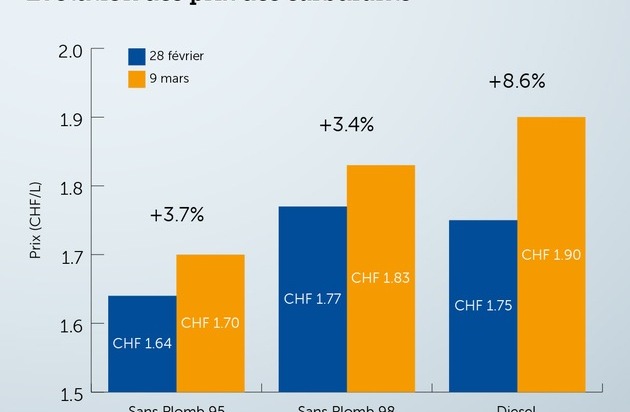 L'analyse d'environ 3200 stations-service, dont les prix ont été actualisés au cours des dix derniers jours, révèle une augmentation marquée des prix des carburant. La hausse la plus forte concerne le diesel. Alors que le prix moyen était encore de 1,75 franc le 28 février, il est passé en moyenne à 1,90 franc au 9 mars. Une augmentation de 8,6 % en dix jours n'est pas courante. Pour l'essence, la hausse est un peu moins marquée. Cela s'explique par le fait que le diesel est davantage demandé par l'industrie.