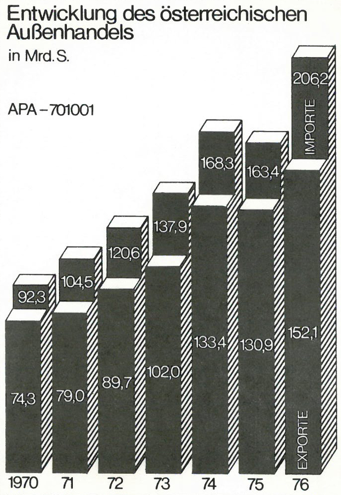 Die "Entwicklung des österreichischen Außenhandels" war die erste Infografik, die die APA-Redaktion ihren Medienkunden am 31. Jänner 1977 als handgezeichnete Schwarz-/Weiß-Grafik postalisch zur Verfügung stellte. 40 Jahre später werden die Informationen als interaktive Grafiken und klickbare Live-Module digital ausgespielt. Rund 1.500 Grafiken für die redaktionelle APA-Berichterstattung und zahlreiche Auftragsgrafiken verlassen jährlich die Redaktion.