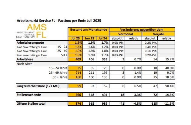 Beim Arbeitsmarkt Service Liechtenstein (AMS FL) waren Ende Juli 409 Personen arbeitslos gemeldet. Die Arbeitslosenquote blieb im Juli mit 1,9 % unverändert gegenüber dem Vormonat. Gegenüber dem Vorjahresmonat erhöhte sich die Arbeitslosenquote um 0,2 Prozentpunkte.