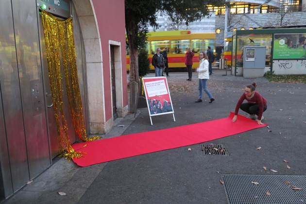 Mit rotem Teppich und goldenem Vorhang hat Helvetas heute in mehreren Schweizer Städten öffentliche WCs dekoriert. Mit der Aktion zum Welttoilettentag macht die Entwicklungsorganisation darauf aufmerksam, dass WCs ein Luxus sind. Denn weltweit müssen eine Milliarde Menschen ihr Geschäft im Freien verrichten. Die Folgen davon sind tödlich.