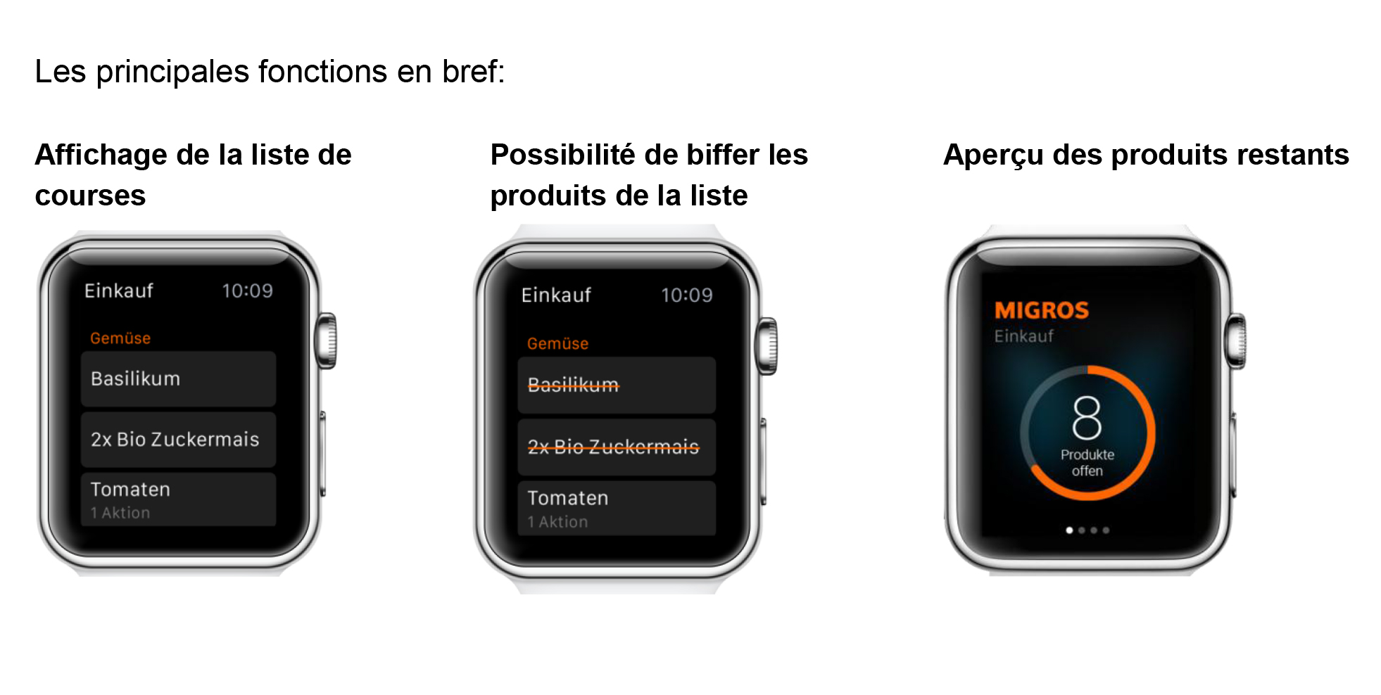 Depuis le lancement réussi de l'application Migros, en avril de l'année dernière, un propriétaire de smartphone sur huit utilise presque quotidiennement l'assistant d'achats numérique qui lui fournit également des informations de première main sur les offres et nouveautés ou les coupons de rabais. Migros prévoit d'intégrer d'autres fonctions de son application dans l'Apple Watch.