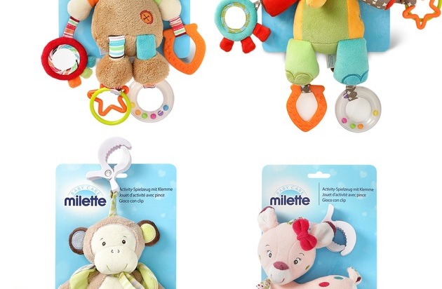 "Jouet d'activité avec pince" de la marque Milette, numéro d'article 7471.422, prix de vente 15,80 francs, dans ses quatre variantes (éléphant, ours, singe et chevreuil) Les autres jouets d'activité de la marque Milette ne sont pas concernés par ce rappel.