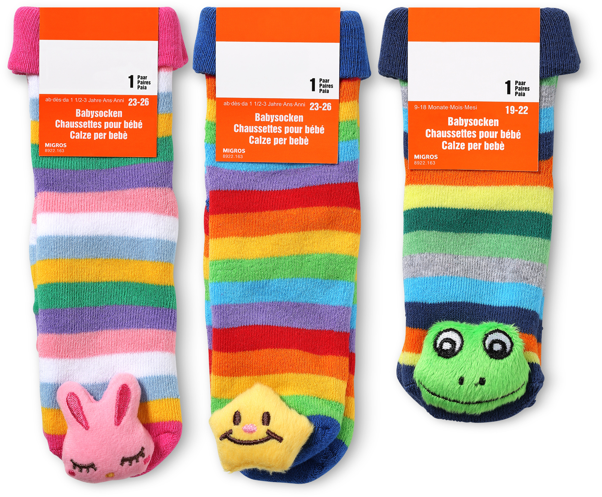 Die bunten Babysocken in verschiedenen Grössen (Artikel-Nr. 8922.163) gibt es in den Farben Türkis, Pink und Grün mit den Plüschsujets Häschen, Frosch und einem Stern. Die aufgenähten Plüschelemente können leicht abgerissen werden, wodurch auch die kleine integrierte Rassel problemlos entfernbar wird. Diese Rassel ist ein verschluckbares Kleinteil; für das Baby besteht eine Erstickungsgefahr.