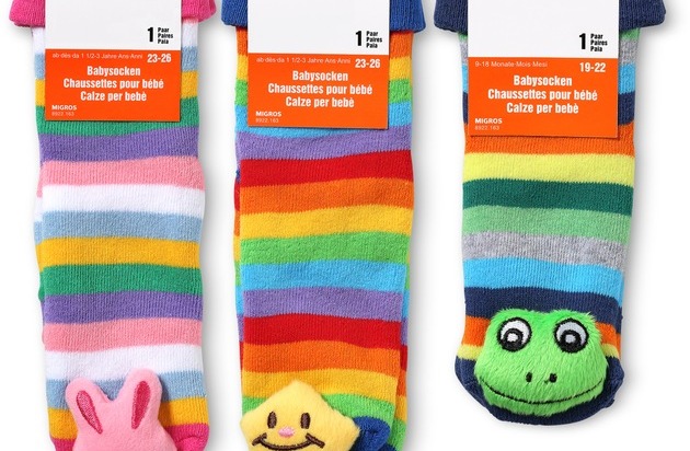 Die Migros ruft die bunt geringelten Babysocken mit einem aufgenähten Plüschköpfchen aus Sicherheitsgründen zurück. Da sich das Plüschelement leicht von der Socke lösen kann, besteht die Gefahr, dass die kleine integrierte Rassel verschluckt werden kann.