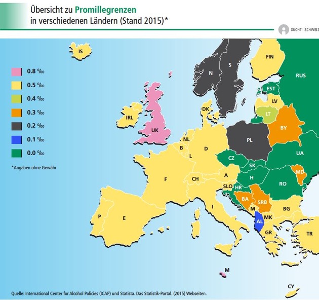 * Die Europakarte mit den Promillegrenzen ist auf www.suchtschweiz.ch in der Rubrik "Infos und Fakten" abrufbar. http://www.suchtschweiz.ch/infos-und-fakten/alkohol/strassenverkehr/promillegrenzen/