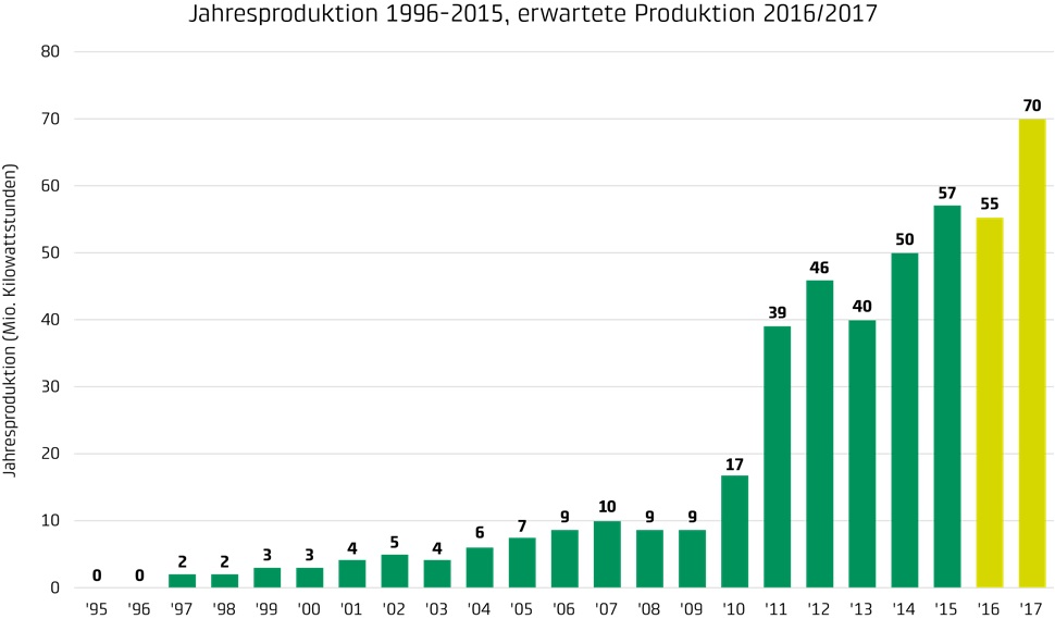 Modernisierung erfolgreich abgeschlossen Mit dem zweiten Repowering-Projekt sind alle Turbinen des Windkraftwerks auf dem neuesten Stand der Technik. Die acht nun ältesten Windturbinen sind erst sechs Jahre alt und dürften für die nächsten Jahre zuverlässig Strom produzieren.