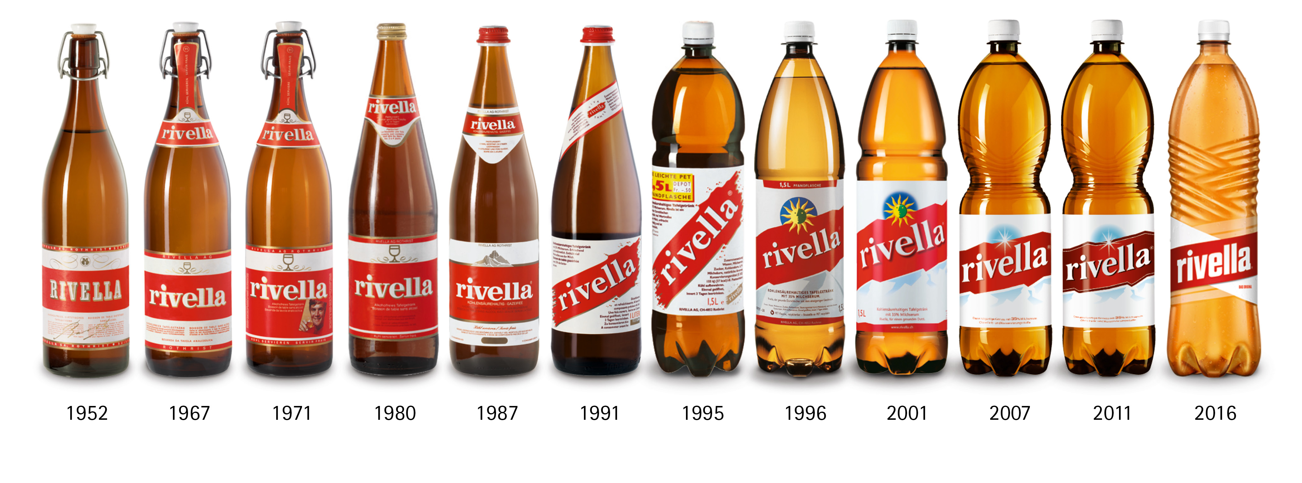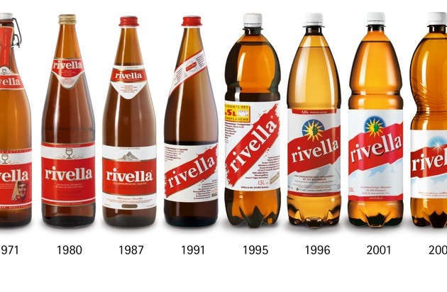 Sur tous les produits Rivella, l'accent est mis désormais sur une structure de marque unique. Les deux grands classiques que sont «Rivella Rouge» et «Rivella Bleu» constituent la pierre angulaire de la marque, avec leur bouteille brune traditionnelle. «Rivella Vert» s'appelle à présent «Rivella Thé vert» et fait partie des variétés aromatiques de la famille, avec les boissons fruitées «Rivella Pêche» et «Rivella Rhubarbe». Ces boissons sont présentées dans une bouteille transparente, chaque boisson étant aisément identifiable à sa couleur. La composition proprement dite des boissons demeure inchangée.