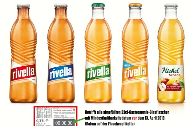 Bei den betreffenden Produkten handelt es sich ausschliesslich um die 33cl-Glasflaschen der Produkte Rivella Rot, Blau, Grüntee und Mango sowie die Schorle von Michel, die in der Gastronomie verkauft werden. Der Rückruf umfasst alle abgefüllten 33cl-Glasflaschen mit Mindesthaltbarkeitsdatum vor dem 13. April 2018 (Datum auf der Flaschenetikette hinten).