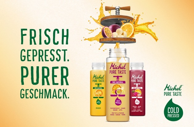 Die schweizweit bekannte Fruchtsaftgetränkemarke Michel lanciert mit der Produktlinie «Michel Pure Taste» erstmals kaltgepresste Frischsäfte. Aus frischen Früchten kaltgepresst und mittels schonendem Hochdruckverfahren haltbar gemacht, stehen diese Säfte dem zu Hause selbst gepressten Saft in nichts nach und bieten Fruchtsaftliebhabern den puren Fruchtgeschmack.