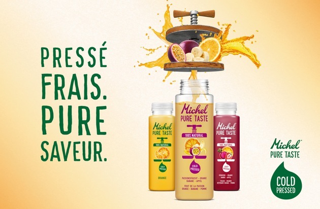 Michel, la marque de jus de fruits réputée dans toute la Suisse, lance pour la première fois des jus frais pressés à froid: la ligne de produits «Michel Pure Taste». Préparés à partir de fruits frais pressés à froid et conservés grâce à une méthode douce par haute pression, ces jus n'ont rien à envier à ceux que l'on presse chez soi et offrent aux amateurs de jus de fruits la saveur pure des fruits.