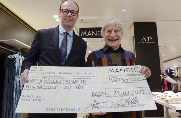 L'assegno con la somma raccolta è stato ufficialmente consegnato al celebre clown Dimitri da Bertrand Jungo, CEO di Manor, nel Grande Magazzino del marchio della Bahnhofstrasse di Zurigo. Con il motto «Regalate felicità due volte», Manor durante il periodo dell'Avvento ha messo in vendita delle carte regalo appositamente disegnate da Dimitri. Manor ha versato nel salvadanaio 1 franco per ogni carta, comprese le carte regalo che portavano altri motivi. Numerosi clienti hanno, d'altra parte, approfittato dell'occasione per fare un dono direttamente alle casse dei grandi magazzini. Ben 300 000 franchi sono stati così raccolti. Si tratta della maggiore somma messa assieme dal lancio dell'operazione caritativa di Natale di Manor.