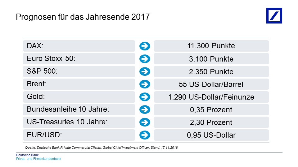 - DAX-Ziel für Ende 2017: 11.300 PunkteNach Einschätzung der Strategen der Deutschen Bank werden Weltwirtschaft und Kapitalmärkte im Jahr 2017 maßgeblich durch politische Entscheidungen bestimmt. Ihr Augenmerk richten die Experten der Bank in ihrem heute in Frankfurt veröffentlichten "Kapitalmarktausblick 2017" vor allem auf die Situation in den USA. "Donald Trump hat im Wahlkampf sehr deutlich Stellung bezogen. Jetzt muss er zeigen, welche Maßnahmen er als Präsident tatsächlich umsetzen kann. Klar ist, dass die US-Konjunktur von seiner Politik zumindest temporär profitieren wird", sagte Oliver Rakau, Volkswirt bei Deutsche Bank Research. Im Mittelpunkt stünden neben einer unternehmensfreundlichen Steuerreform auch Pläne für ein umfassendes Investitionsprogramm. Nur das Ausmaß und der zeitliche Rahmen seien noch unklar.