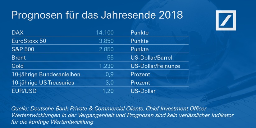- DAX-Ziel für Ende 2018: 14.100 PunkteDie Weltwirtschaft sollte im Jahr 2018 anhaltend solide wachsen und die US-Geldpolitik sich allmählich normalisieren. Damit rechnen die Kapitalmarktexperten der Deutschen Bank in ihrem heute in Frankfurt veröffentlichten "Kapitalmarktausblick 2018". Sie weisen allerdings auch auf mögliche ökonomische Gefahren hin, vor allem auf eine zu schnell steigende Inflation. "Wenn der Preisdruck stärker als erwartet zunehmen sollte, könnten sich die Notenbanken zu einem aggressiveren Ausstieg aus ihrer nach wie vor expansiven Geldpolitik gedrängt fühlen - mit entsprechend negativen Auswirkungen auf die konjunkturelle Entwicklung weltweit", sagte Stefan Schneider, Chefökonom für Deutschland bei Deutsche Bank Research.