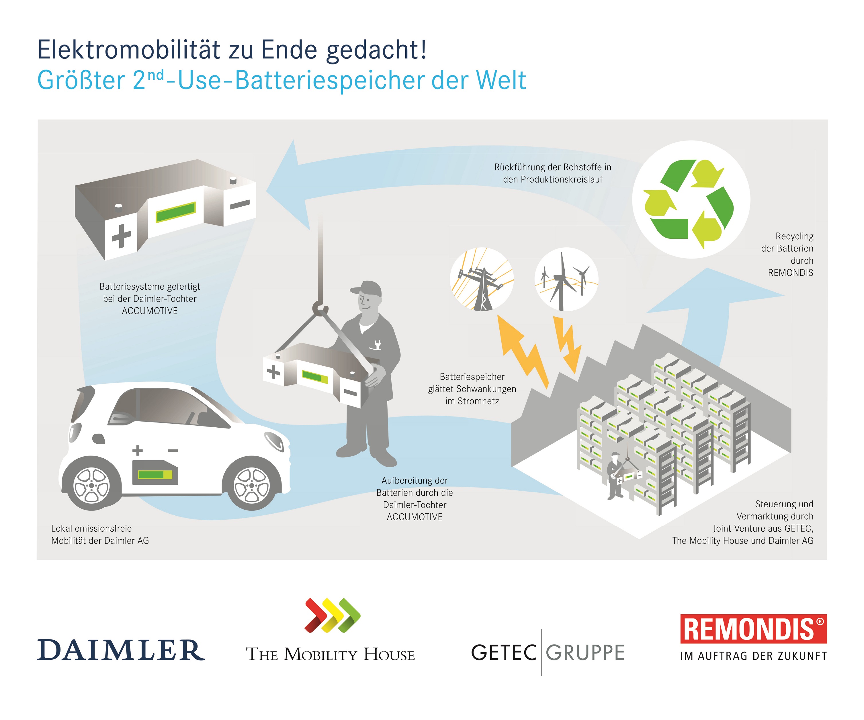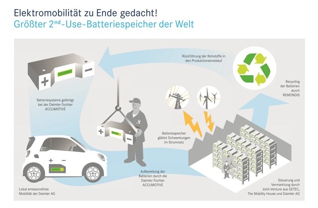 Unter dem Motto "Elektromobilität zu Ende gedacht" bilden Daimler, The Mobility House, GETEC und REMONDIS mit dem Projekt in Lünen die gesamte Batterie-Wertschöpfungs- und Verwertungskette ab: Von der Herstellung und Aufbereitung der Batteriesysteme bei der Daimler-Tochter ACCUMOTIVE, dem entsprechenden Elektro- und Plug-in Hybrid-Fahrzeug-Angebot der Daimler AG, über die Installation und Vermarktung des stationären Batteriespeichers an den Energiemärkten durch The Mobility House und GETEC bis hin zum Recycling der Batteriesysteme am Ende ihres Lebenszyklus und der Rückführung der wertvollen Rohstoffe in den Produktionskreislauf, der sich REMONDIS künftig widmen wird.
