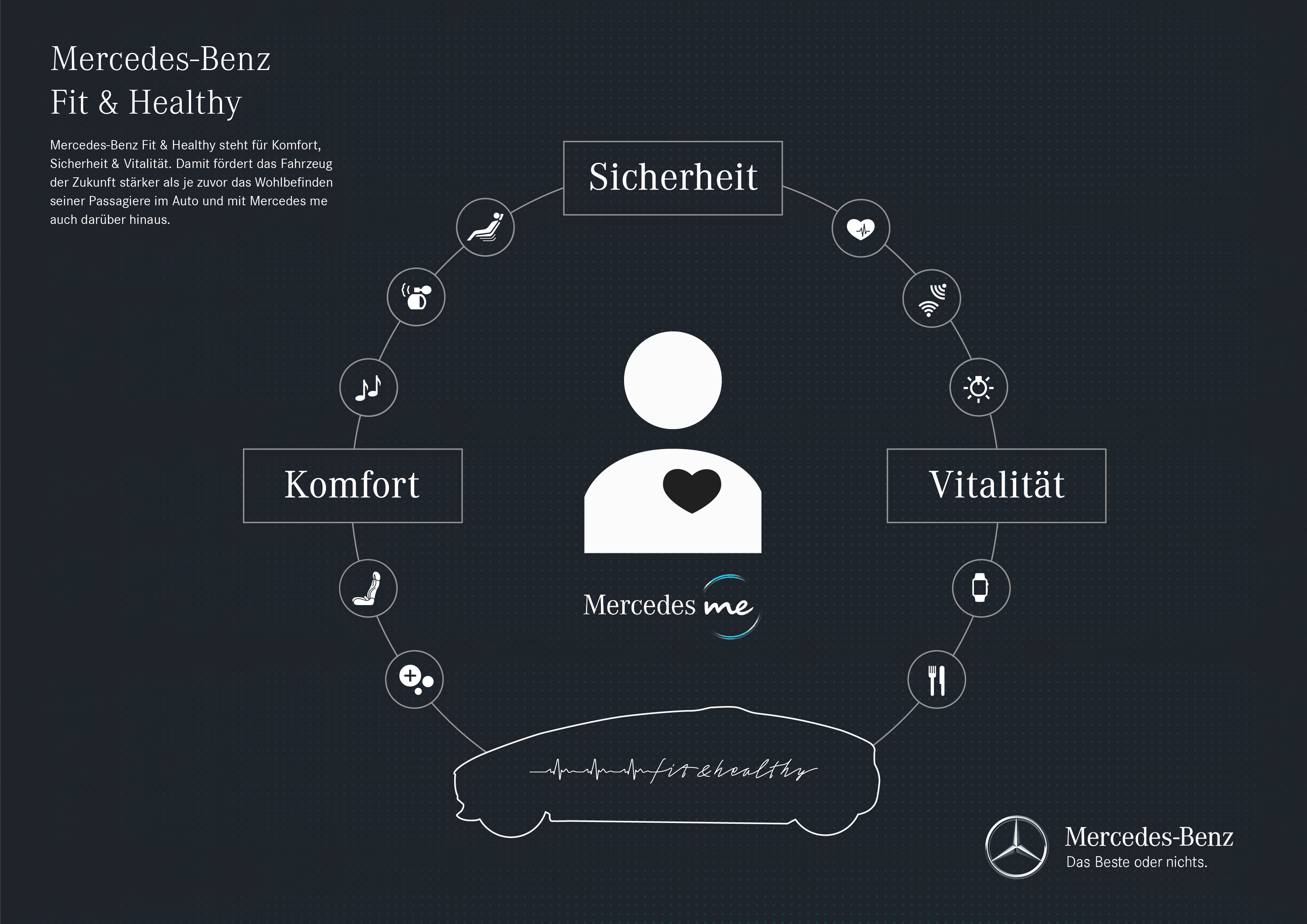 Der Anspruch von Mercedes-Benz ist ein Auto, das dazu beiträgt, das Wohlbefinden seiner Passagiere zu fördern. Mercedes-Benz Fahrzeuge von morgen steigern Fitness und Wohlbefinden ihrer Passagiere noch individueller und bieten Erlebniswelten für alle Sinne. Im Rahmen von Mercedes me plant Mercedes-Benz zudem ein ganzheitliches Ökosystem, das den Nutzer auch ausserhalb des Fahrzeugs bei einem aktiven und gesunden Lebensstil unterstützt. Die vom Nutzer autorisierten Daten sollen im fahrzeugeigenen Backend gebündelt werden, um ihm personalisierte Empfehlungen für mehr Wohlbefinden und Fitness zu geben. Dabei sind Transparenz, Selbstbestimmung und Datensicherheit massgebend. Mit dem Konzeptfahrzeug "Fit & Healthy" und dem Exponat "Wall of Wishes" von Mercedes me gibt Mercedes-Benz auf der Consumer Electronics Show (CES) in Las Vegas einen Ausblick auf das ganzheitliche Konzept und auf konkrete Features.