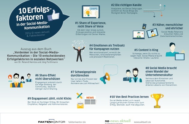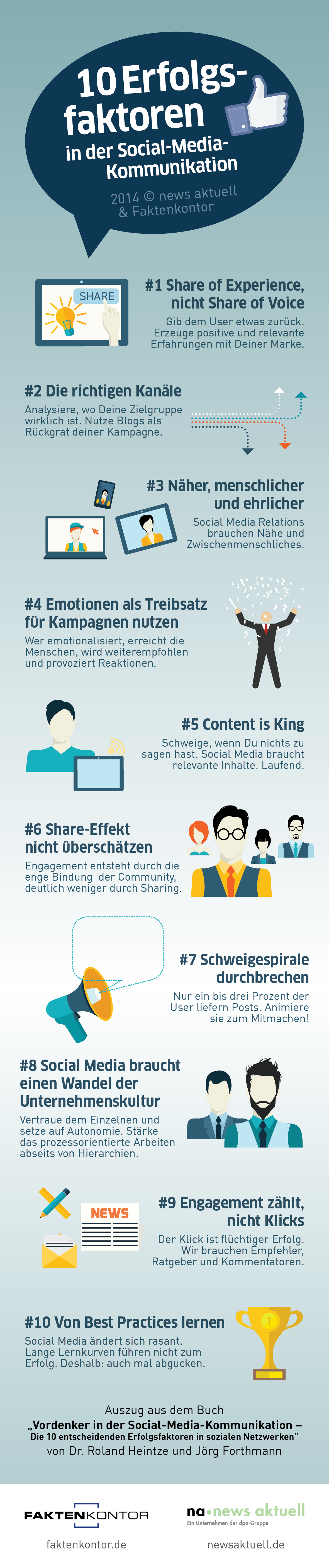 Die Erfolgsfaktoren sind ein Auszug aus dem Buch "Vordenker in der Social-Media-Kommunikation - Die 10 entscheidenden Erfolgsfaktoren in sozialen Netzwerken" von Dr. Roland Heintze (Faktenkontor) und Jörg Forthmann (Faktenkontor).