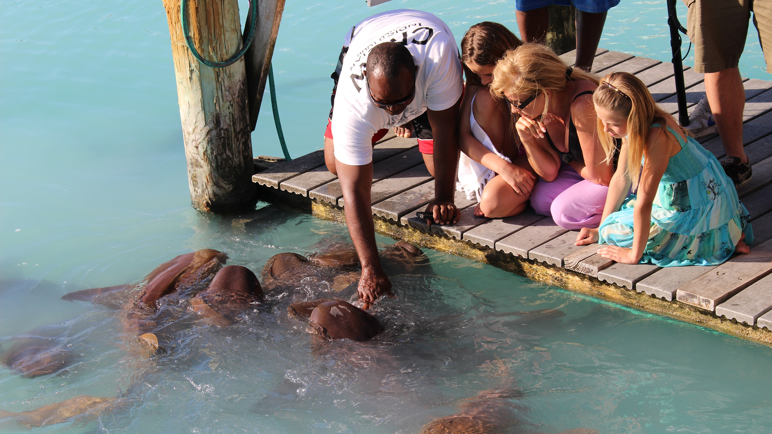 Am nächsten Tag geht es weiter zur Insel Compass Cay. Inselbesucher erwartet eine spektakuläre Attraktion: Haie streicheln! Die gefürchteten Meeresräuber sind ganz zutraulich und schwimmen direkt an den Steg. Doch der sonst so mutige Robert und seine drei Frauen haben großen Respekt und betrachten die atemberaubenden Tiere lieber mit einem kleinen Sicherheitsabstand.