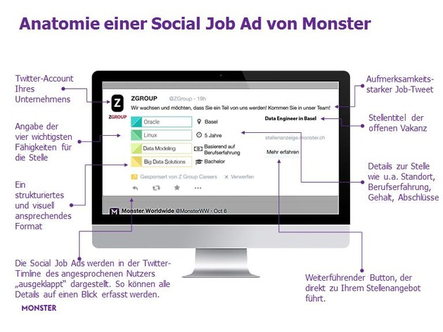 Zukünftig können Stellenanzeigen automatisch und zeitnah zur Schaltung auf monster.ch in den Timelines von Twitter-Nutzern angezeigt werden, deren berufliches Profil zu dem des gesuchten Kandidaten passt. Die Monster Social Job Ads unterstützen Unternehmen dabei, ihren nächsten Mitarbeiter mit Hilfe von sozialen Netzwerken zu finden. Basis ist ein optimiertes Targeting (Zielgruppendefinition), das im Rahmen des so genannten Social Recruitings bisher eine der grössten Herausforderungen für innovative Recruiter darstellte. Alles was sie für die Schaltung der Social Job Ads benötigen, ist die reguläre Stellenanzeige für ihr Unternehmen auf monster.ch und einen Twitter-Account.