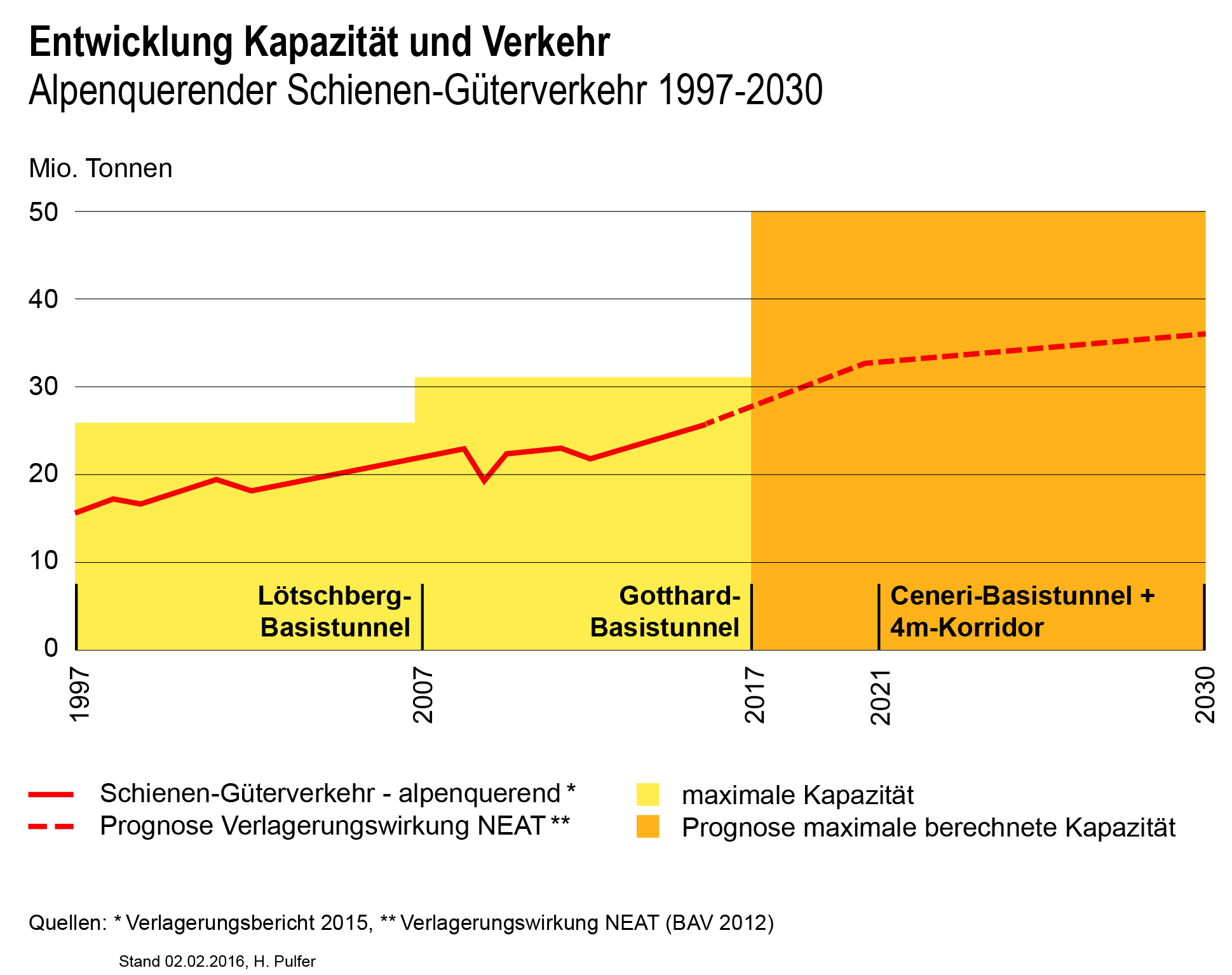 Mit dem Bau der NEAT und dem 4-Meter-Korridor zwischen Basel-Chiasso steigt die Trassenkapazität für Güterzüge um weitere 30 Prozent (von heute 300 Trassen pro Tag auf 390). «Mit den Basistunnels können ausserdem längere und schwerere Züge verkehren», erklärte Heinz Pulfer, Experte für internationale Bahnplanung, an der Medienkonferenz in Bern. Er kommt in einer Studie zum Schluss, dass mit der NEAT rund 50 Millionen Tonnen Güter pro Jahr auf der Schiene durch die Alpen transportiert werden können. Heute bewältigen Strasse und Schiene zusammen 38,5 Millionen Tonnen.