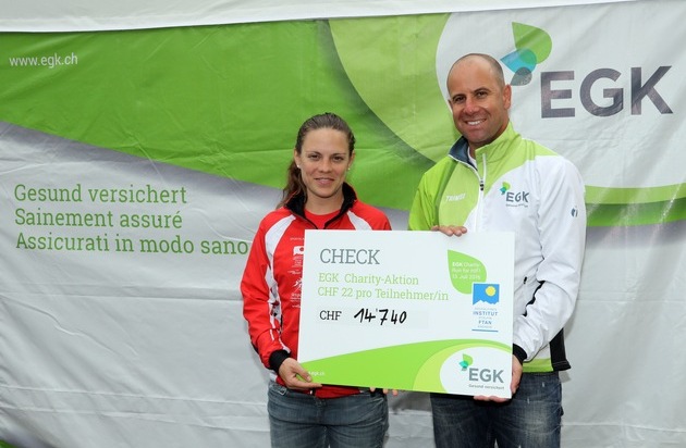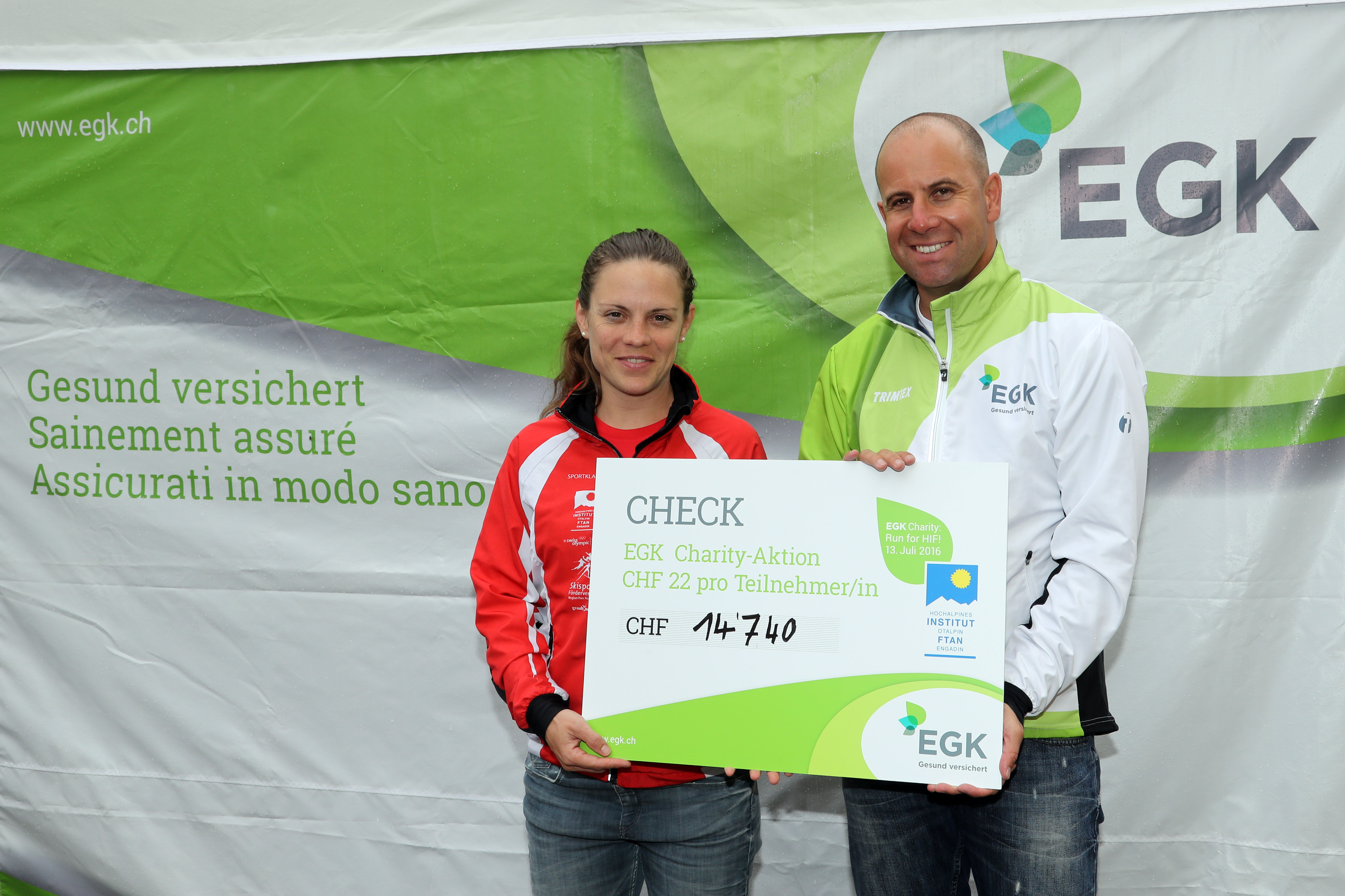 Es ist so eine Sache mit Sportanlässen - kaum sind sie vorbei, sind sie vergessen. Dem wollte die EGK-Gesundheitskasse als Presenting Partner der JWOC 2016 bewusst etwas entgegenhalten und dem Engadin als Austragungsort etwas Bleibendes schaffen. Deshalb schickte die EGK-Gesundheitskasse am Mittwoch, 13. Juli 2016, ab 13.30 Uhr, am «EGK Charity: Run for HIF!» 670 Profi- und Hobby-OL-Läufer/-innen ins Rennen und hat pro Teilnehmer an diesem Wohltätigkeits-OL 22 Franken an das Hochalpine Institut Ftan gespendet, dessen Sportklasse dieses Jahr ihren 22. Geburtstag feiert. In feierlichem Rahmen hat Reto Flury, Geschäftsleiter der EGK gestern Nachmittag nach dem erfolgreichen Charity-Lauf der Leiterin der Sportklasse am Hochalpinen Institut Ftan Muriel Hüberli einen Check über 14'740 Franken überreicht.