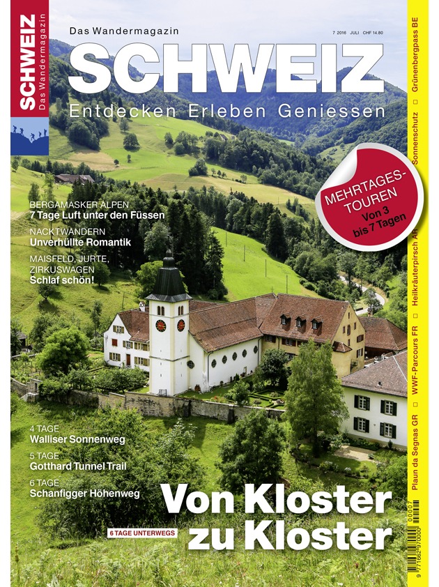 - Von Kloster zu Kloster - Schanfigger Höhenweg - Gotthard Tunnel Trail - Orubische Alpen - Kurios übernachten - Sonnenschutz - Heilkräuter - Nacktwandern - Die schönsten Kurztouren im Juli