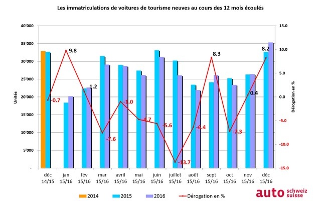 L'an 2015 a été marqué par l'importante dévaluation de l'euro face au franc suisse. Des baisses de prix - une bonne et rapide réaction de la part des importateurs officiels d'automobiles en suisse - avaient conduit au deuxième meilleur résultat depuis le tournant du millénaire. Dans ce contexte, les membres d'auto-suisse s'attendaient bel et bien à un repli des ventes en 2016. La baisse s'est cependant avérée moins prononcée que les prévisions, et ce également grâce à un très bon résultat de 35 325 (+2 683 respectivement +8,2 %) premières immatriculations en décembre.