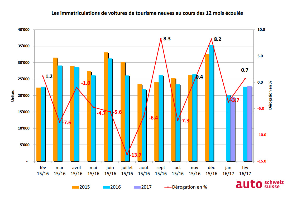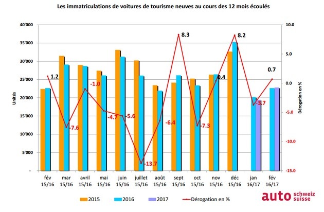 Au cours des deux premiers mois de 2017, on a vendu 42 260 voitures de tourisme neuves. Compte tenu de l'effet de l'année bissextile, le recul de 598 immatriculations ou de 1,4 % en comparaison avec la même période de l'année précédente est presque négligeable. Car en Suisse et dans la principauté du Liechtenstein, environ 1200 autos neuves sont mises en circulation chaque jour ouvrable. Au cours des mois à venir, le volume du marché se rapprochera donc probablement à celui de 2016, ce qui dépasserait même les attentes des membres d'auto-suisse.