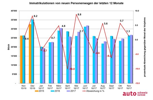 Da der abgelaufene November die identische Anzahl an Werktagen hatte wie der Vorjahresmonat, ist der Zuwachs von 1,3 Prozent umso bemerkenswerter. Die positive Entwicklung im vorletzten Monat des Jahres trägt zu einem kumulierten Ergebnis mit leicht grünen Vorzeichen bei. Bisher sind im 2017 282'956 Neuimmatrikulationen registriert worden, 963 mehr als zum gleichen Zeitpunkt 2016. Der Zuwachs von 0,3 Prozent entspricht den Prognosen von auto-schweiz, wonach zum Jahresende ein ähnliches Ergebnis wie im erfolgreichen Vorjahr resultieren sollte. Damals waren am Ende 317'318 Neuwagen eingelöst worden.