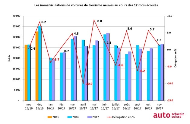 La progression de 1,3 % est effectif, compte tenu du fait que le mois de novembre écoulé comprenait le même nombre de jours ouvrables qu'il y a une année. Cette évolution positive de l'avant-dernier mois de l'année contribue à un résultat cumulé dans le vert. Jusqu'à présent, on a enregistré 282 956 nouvelles immatriculations en 2017, soit 963 de plus qu'au même moment en 2016. La hausse cumulée de 0,3 % est conforme aux pronostics d'auto-suisse, qui table sur un résultat de fin d'année similaire à celui de l'excellente année précédente, où 317 318 voitures neuves ont été immatriculées au total.