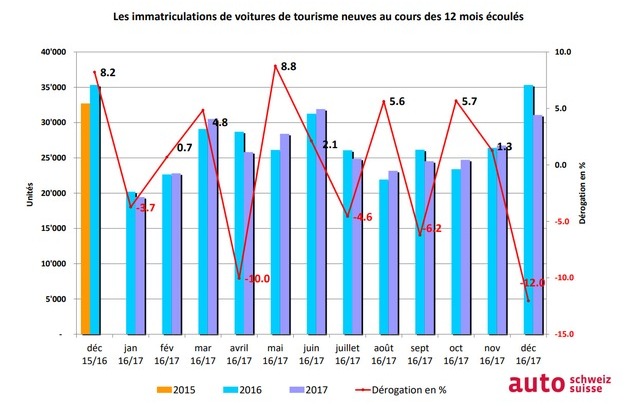 Les attentes pour l'année automobile 2017 ont largement été remplies. Seules 3290 voitures de tourisme manquaient pour répéter le résultat de l'année dernière. Cela résulte entre autres du mois de décembre écoulé, où le nombre record de 35 000 immatriculations en 2016 n'a pas pu être égalisé. Cependant, 31 072 mises en circulation en font le quatrième meilleur mois de décembre depuis le nouveau millénaire ainsi que le deuxième mois de 2017 le plus fort après juin. Avec une impressionnante part de voitures de tourisme quatre roues motrices de 53,2 %, le mois dernier a en outre réussi à enregistrer un autre niveau record : pour la première fois de leur histoire, les 4x4 vendues sur l'ensemble d'un mois étaient plus nombreux que les voitures sans transmission intégrale.