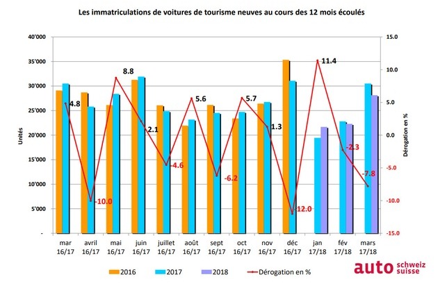 Le marché automobile en Suisse et dans la principauté du Lichtenstein comparable à celui de l'année précédente. Exactement 72'809 véhicules neufs ont été mis en circulation depuis le début de l'année. Cela correspond à une légère baisse de 680 immatriculations ou 0,9% par rapport à l'année précédente, ce qui s'explique en partie par les Fêtes de Pâques qui chevauchent la fin du trimestre, donnant au mois de mars 2 jours ouverts de moins et justifie donc une baisse de 7,8% par rapport à Mars 2017.