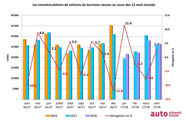 En Suisse, le mois d'avril est une période de vacances. Dans la quasi-totalité des cantons, les écoles ont été fermées pendant une semaine au moins et les familles étaient en déplacement. Il est donc remarquable qu'en dépit de ces circonstances, on ait fait immatriculer au mois passé 704 voitures de tourisme neuves de plus qu'il y a une année, mais cela s'explique aussi par les deux journées ouvrables supplémentaires. Christoph Wolnik, porte-parole d'auto-suisse, donne commente la situation comme suit : « Nous sommes parfaitement satisfaits des résultats enregistrés cette année jusqu'à présent. Pour l'année complète, nous continuerons à avoir pour objectif de maintenir le résultat de l'année précédente de près de 315'000 voitures de tourisme neuves. Si après quatre mois, nous nous trouvons maintenant quasiment à la voiture près au niveau de 2017, cela est dû à un heureux hasard ».
