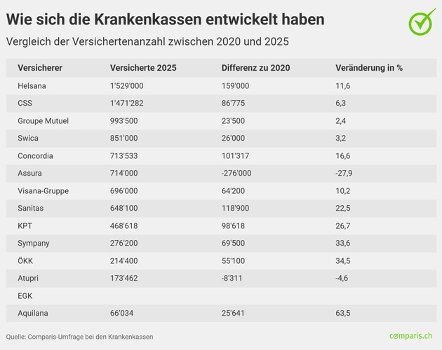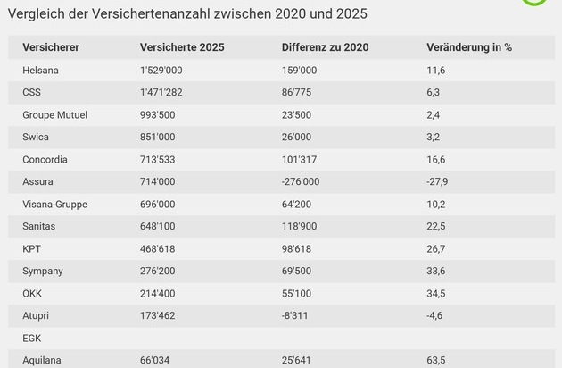 Am meisten Versicherte gewann in der Grundversicherung für das Prämienjahr 2025 die Helsana. Ihr Bestand erhöhte sich auf Anfang 2025 um 108’000 Kunden. Damit hat der Versicherer per 2025 1'529'000 Versicherte und löst die CSS als bisherige Branchenleaderin ab. Grosse Verliererin ist die Krankenkasse KTP. Sie verlor 77’435 Versicherte. Eine zusätzliche repräsentative Umfrage im Auftrag von Comparis zeigt zudem einen zunehmenden Einfluss digitaler Kommunikationsmittel auf die Wahl des Krankenkassenmodells. Im Jahr 2025 legen 54 Prozent der Befragten Wert auf Erinnerungen an Arztbesuche via SMS oder Messenger-Dienste.