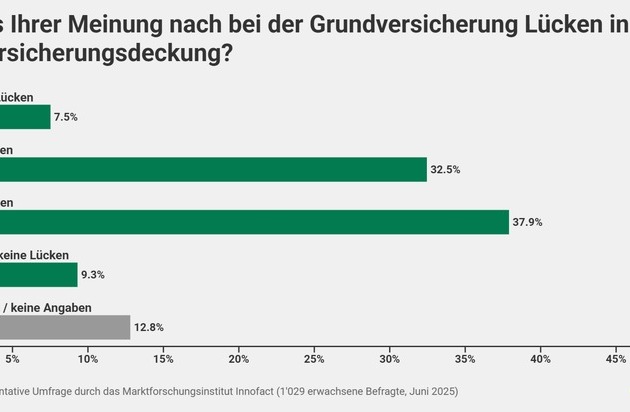Zürich, 05. August 2025 – Die Wahrnehmung, dass die Grundversicherung nicht alle Bedürfnisse abdeckt, ist weitverbreitet. Knapp 40 Prozent der Schweizer Bevölkerung haben das Gefühl, Lücken im obligatorischen Schutz wahrzunehmen. Besonders ausgeprägt ist das bei den 36- bis 55-Jährigen, von denen 45,9 Prozent Lücken sehen, verglichen mit nur 31,9 Prozent bei den über 56-Jährigen. Das zeigt eine repräsentative Befragung des Online-Vergleichsdienstes comparis.ch.