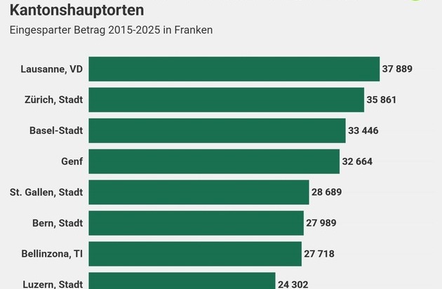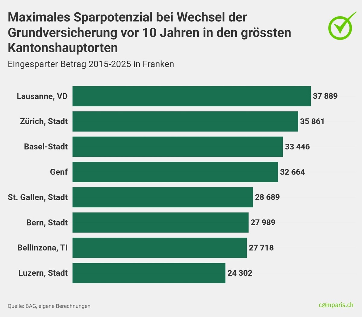 Wer per Januar 2015 einmal von der damals teuersten zur damals günstigsten Kasse gewechselt hätte, würde in Zürich bis Ende 2025 ohne weitere Wechsel 35’861 Franken (49,7 Prozent), in Bern 27’989 Franken (41,3 Prozent), in Luzern 24’302 Franken (43,6 Prozent), in St. Gallen 28’689 Franken (47,6 Prozent), in Bellinzona 27’718 Franken (40,7 Prozent), in Genf 32’664 Franken (43,5 Prozent) und in Lausanne 37’889 Franken (48,6 Prozent) sparen. In Basel Stadt wäre man dann 33’446 Franken (43,6 Prozent) reicher.