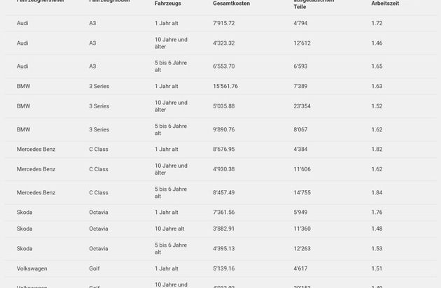 Auffällig ist ein Kostensprung bei den 5- bis 6-jährigen Autos gegenüber den 10-jährigen Fahrzeugen. Am deutlichsten zeigt sich der Unterschied beim BMW 3er. Die durchschnittlichen Reparaturkosten belaufen sich hier für die jüngeren Autos auf 9’891 Franken. Die alten Modelle werden im Schnitt für lediglich 5’036 Franken repariert.