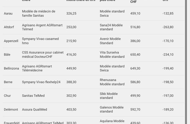 Le potentiel d’économies est bien réel et ce, même pour celles et ceux qui ont déjà souscrit la franchise maximale de 2500 francs. Ainsi, plus de 723 personnes assurées ayant opté pour cette franchise pourraient, avec le même modèle, faire baisser de 20 à 30 % le poids des primes dans leur budget en passant l’an prochain à l’une des cinq caisses les plus avantageuses. Ce chiffre s’élèverait à environ 21 000 si les personnes en question changeaient pour l’offre la moins chère.