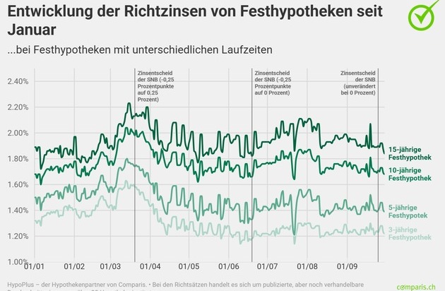 Die von über 30 Kreditinstituten öffentlich publizierten Referenzzinsen (sogenannte Richtzinsen) für 10-jährige Festhypotheken lagen bei 1,68 Prozent (Stand: 30. September) mit 0,09 Prozentpunkten niedriger als Ende Juni. Gegenüber dem Jahresanfang sind sie lediglich 0,01 Prozentpunkte niedriger. Der Richtsatz für 5-jährige Festhypotheken lag am 30. September bei 1,39 Prozent ähnlich hoch wie Ende Juni mit 1,4 Prozent. Am Jahresanfang betrug der Richtsatz für 5-jährige Festhypotheken noch 1,5 Prozent.