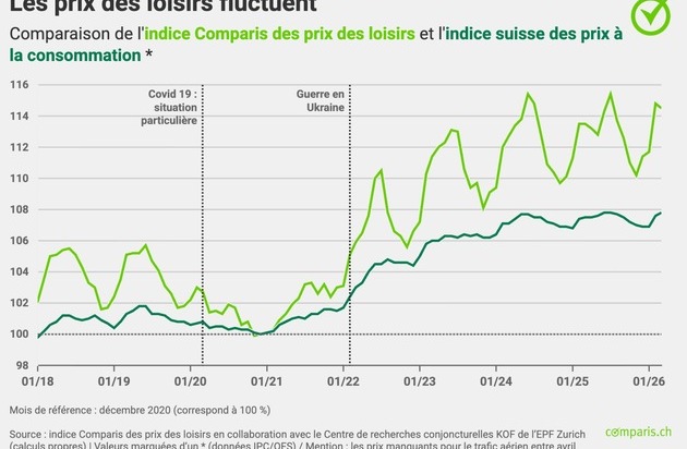 L’indice suisse des prix à la consommation (IPC) mesure l’évolution des prix sur la base d’un panier représentatif d’environ 1050 biens et services. L’inflation se caractérise par une baisse persistante de la valeur monétaire ou par une augmentation du niveau moyen des prix. L’IPC a été restructuré au début de l’année 2026 et comprend 13 catégories principales, parmi lesquelles figure désormais la catégorie principale « Assurances et services financiers ». En revanche, les grands postes de dépenses, tels que les primes des assurances sociales ou les impôts directs, ne sont pas pris en compte. L’IPC ne reflète donc pas l’inflation telle qu’elle est réellement ressentie par les consommatrices et les consommateurs.L’indice Comparis des prix des loisirs, établi en collaboration avec le Centre de recherches conjoncturelles (KOF) de l’EPFZ, reflète exclusivement l’inflation à l’œuvre dans les domaines des loisirs et de la culture, de l’hôtellerie-restauration et des voyages. Par ailleurs, Comparis tient explicitement compte de facteurs tels que le type de ménage, la catégorie de revenus et la région linguistique. Remarque importante : les chiffres marqués d’un (*) ont été calculés directement par l’Office fédéral de la statistique (IPC/OFS) ou reposent sur les chiffres de l’IPC/OFS.