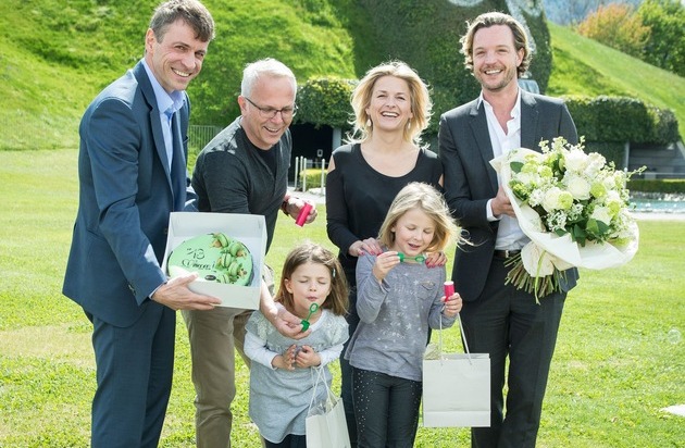 Als 13 Millionste Besucher wurden Ingrid Siller und Hannes Irowec mit ihren beiden Töchtern Sofia und Leni von Markus Langes-Swarovski und Stefan Isser vor dem Riesen feierlich in Empfang genommen. Nach der Begrüßung ging es für die Familie schnurstracks zu einem der neuen Highlights der Swarovski Kristallwelten - dem Spielturm.