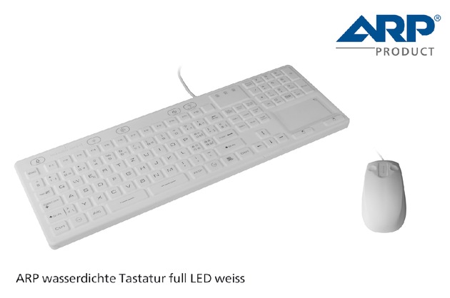 Die neue wasserdichte ARP Tastatur mit LED-Hintergrundbeleuchtung ist ab sofort zum Preis von CHF 66.- im ARP Online-Shop erhältlich (Art.-Nr.: 5041561-40). Dort findet man auch alle weiteren technischen Spezifikationen und die tagesaktuelle Verfügbarkeit. Die Tastatur ist auch mit US-englischem Tastaturlayout verfügbar.