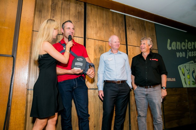 Miriam Rickli moderierte den Anlass und läutete nach Interviews mit Swisslos-CEO Roger Fasnacht, Andreas Balsiger vom Eidgenössischen Differenzler Jass Verband EDJV und Produkt-Manager Marco Bacchetta die erste Turnierrunde ein: In dem mit zahlreichen urchigen Gegenständen dekorierten Raum - vom gemütlichen Ohrensessel vorm braunen Röhrenfernseher bis zu antiken Heugabeln war alles da - wurden auf den Jasstischen Tablets aufgestellt, an denen die VIPs ihre Fähigkeiten direkt auf jass.ch unter Beweis stellen konnten.