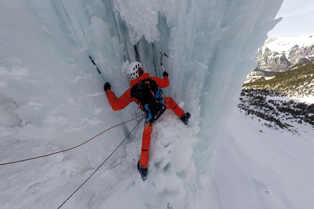 Pour grimper la glace, notamment sur les cascades et stalactites, on a besoin d'appareils spécifiques et de crampons. L'athlète de l'équipe Mammut Pro Dani Arnold fait partie dans cette discipline des meilleurs au monde. En mars 2015, il s'est attaqué au classique Rübezahl, haut de 215 m, à Kandersteg, en Suisse, avec le responsable produit de Mammut Fritz Schäfer et a documenté cette voie sur glace spectaculaire dans une perspective à 360°.